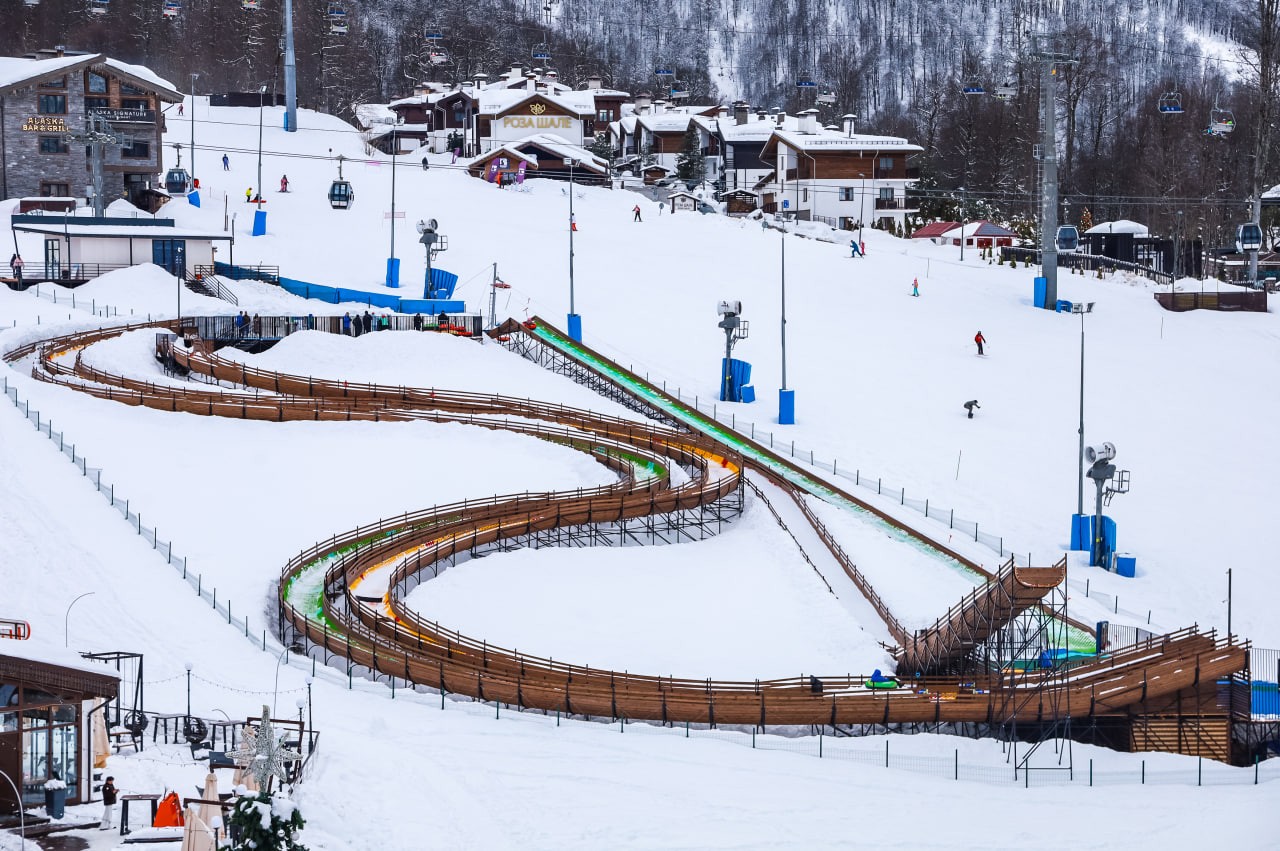 Тюбинг-парк на Роза Хутор включает три параллельные трассы разной сложности.