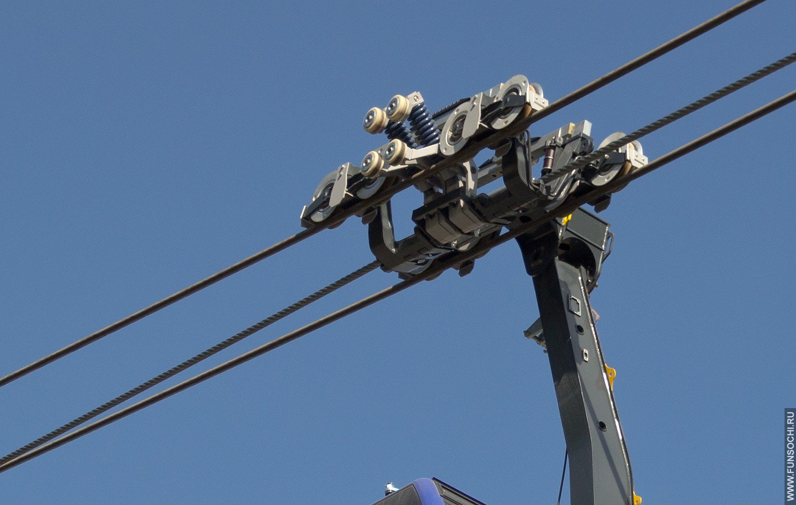 На фото ниже узел крепления кабинки на канатах в увеличенном масштабе — хорошо видно, как ролики передвигаются по двум несущим канатам (они имеют более ровную поверхность), а средний канат является тяговым, приводящим кабинки в движение. Такая конструкция обеспечивает максимальную надежность и безопасность пассажиров, а также позволяет обойтись относительно малым числом промежуточных опор — при длине 5369,7 метров, на этой дороге используется всего 5 опор (высотой 64, 39, 66.5, 78.5 и 48 метров).