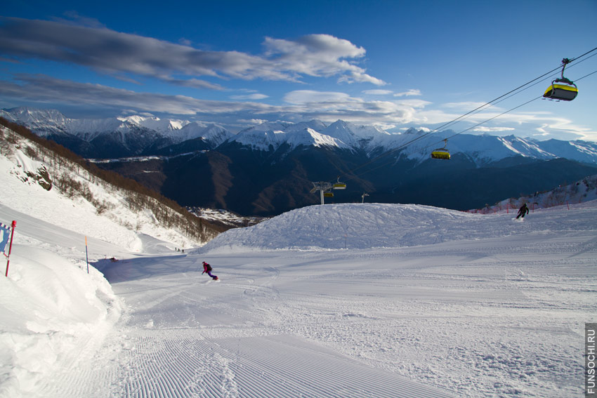 Пока спускались, на канатку Эдельвейс только начали навешивать кресла. Во время подъема на канатке на трассах также никого не было, только наши следы. Навстречу в креслах спускались сотрудники курорта и кафе внизу Эдельвейса.